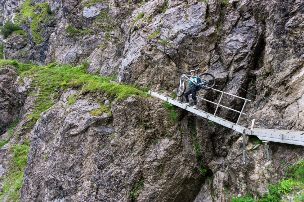 Am nächsten Tag regnet es. Unser Gastvater lacht uns als begeisterter Bergradler an und meint: „Desch ghört dazu“. Wir ziehen unsere Regenhosen und die Jacken an und radeln uns im Rappenalptal im Süden von Oberstdorf ein. Die Sicht ist passabel, der Regen fällt gerade ohne Wind auf uns herab und wir schultern bald unsere Räder über den Schrofenpass. An engen Stellen gibt es Seilverankerungen, an denen wir uns festhalten können. Erfreut, über diesen sportlichen Einstieg in unsere Transalp, tappen wir zügig den kleinen Steinpfad, teils mit Eisenstufen versehen, empor. Am Pass empfängt uns eine Wanderfamilie mit den Worten: „Macht DAS wirklich Spaß?“. Wir nicken und essen Schokokekse.
