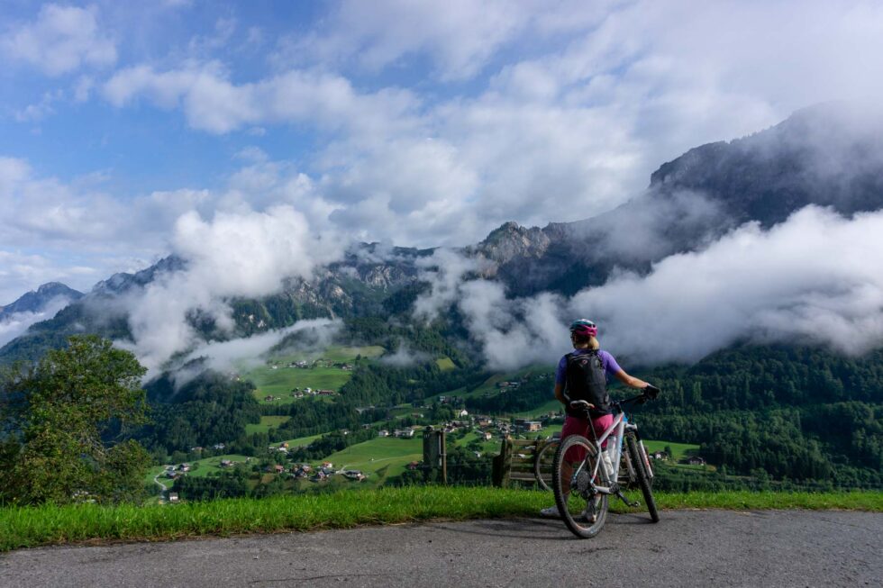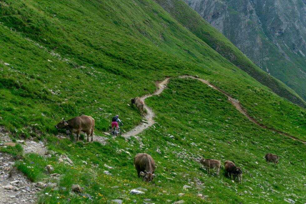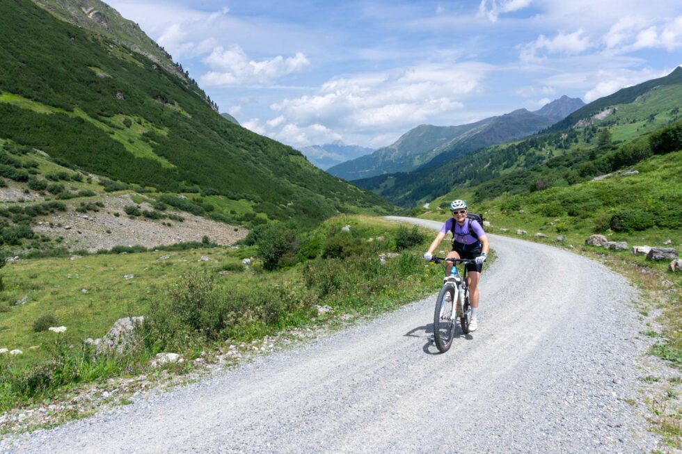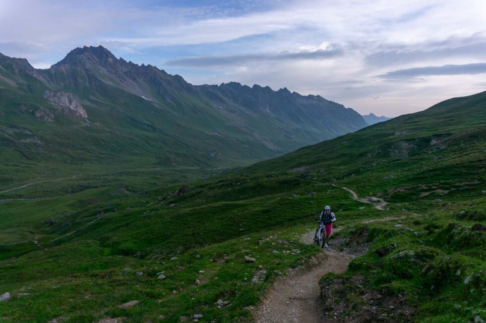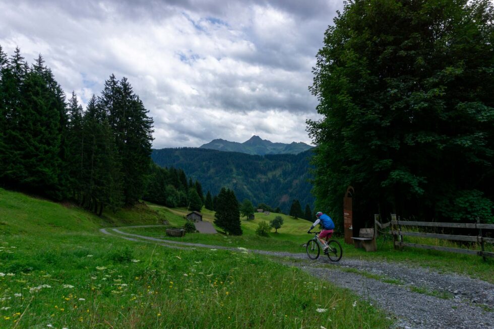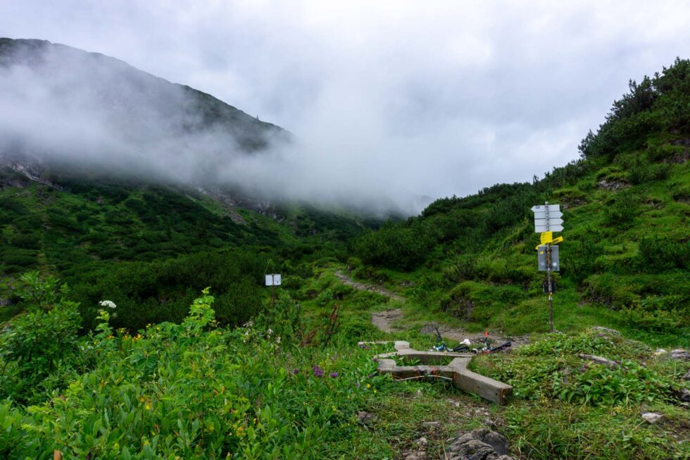 Um 9:00 Uhr schlüpfen wir in trockene Fahrradschuhe und hoffen, dass sich daran erstmal nichts ändert. Die Auffahrt zum Kristbergsattel tritt sich lässig weg. Während des stetigen Auf und Ab im Silbertal unterhalten wir uns über die wichtigsten Themen auf einer Transalp: Brotzeit, Bike und Beine.