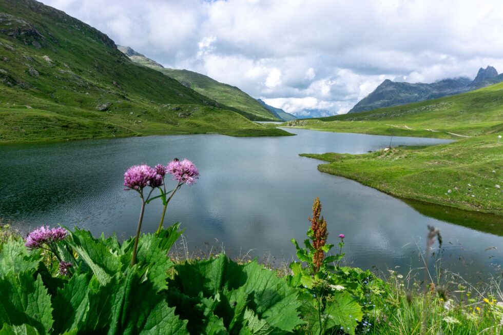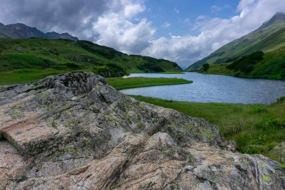 Wir tauchen nicht nur geographisch ins Europaschutzgebiet Verwall ein, sondern auch mit Fuß und Fahrrad. Die Moorlandschaft um den Langen See herum ist sumpfig, wir schieben unsere Räder oder tragen sie und hüpfen damit von Stein zu Stein. Nach zwei Stunden erreichen wir eine feste Fahrstraße und kurbeln locker mit unseren leichten MTB den steilen Moränenrücken zur Neuen Heilbronner Hütte hoch. Dort essen wir Krut- und Keesspätzli und schlafen tief und fest in einem 6-Bett-Zimmer.