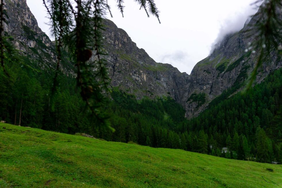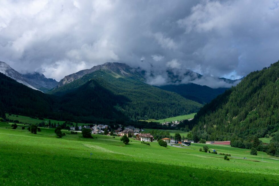 Ab Sur En im Unterengadin in der Schweiz biegen wir südöstlich in das Uina-Tal ein. Das Wetter ist instabil und die Wolken sehen bedrohlich dunkel aus. Wir sind uns nicht sicher, wie weit wir heute kommen. In Sur En entdecken wir eine Pension mit Leuchtschrift „Zimmer frei“. Wir erinnern uns beide, dass wir im Zweifel dort hin zurückkehren können.