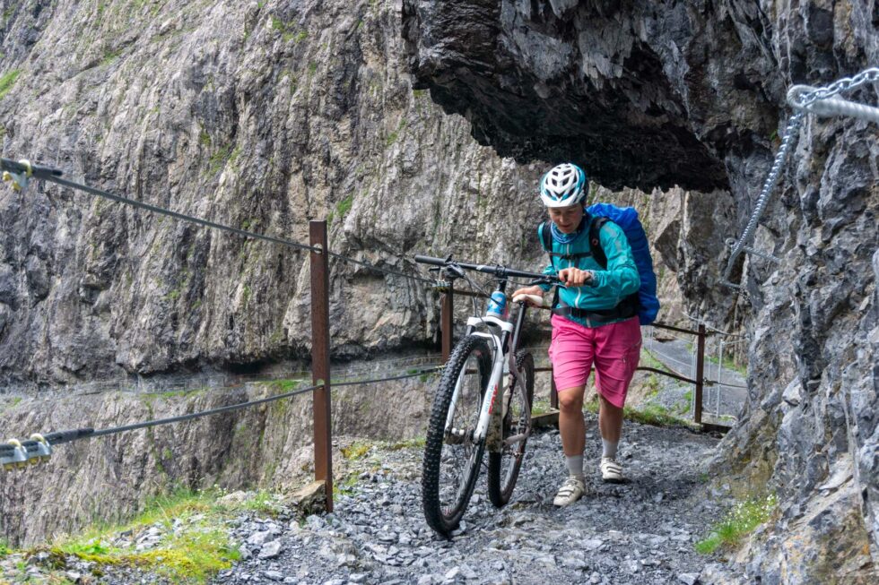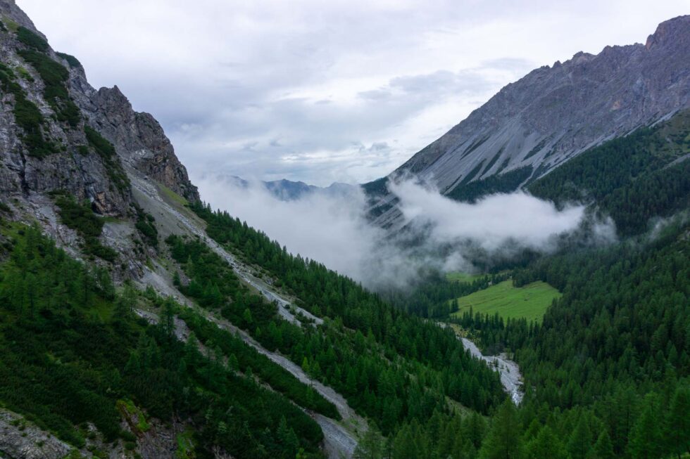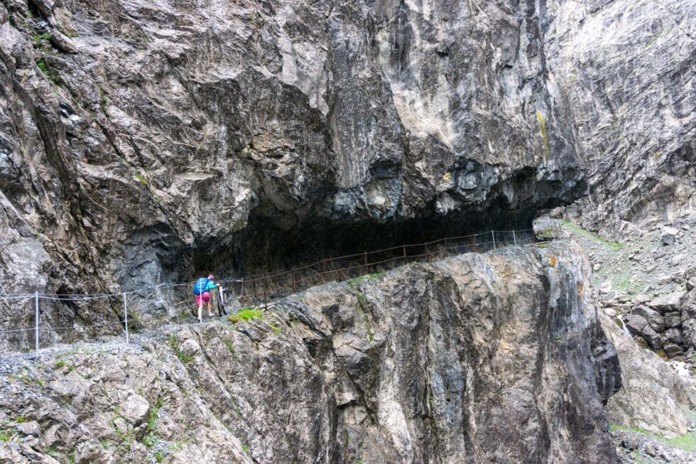 Einige Schokokekse später wird unser Fahrweg schmäler und steiler und wir sehen in die Uina Schlucht hinein. Ein Weg wurde in den Felsen wie eine Galerie gesprengt. Eine solche Schlucht habe ich noch nie gesehen und „unsere“ Höllentalklamm in Garmisch kommt mir winzig vor. Es tropft von allen Seiten und es rauscht der Wasserfall. Wir schieben beeindruckt unsere Fahrräder durch die Schlucht. Manche Stellen sind steil und wir tragen kurz. Nach 500 Höhenmetern kommen wir aus der Schlucht heraus und münden in ein großflächiges grünes Plateau. Kurzzeitig hellt es auf, fünf Minuten später zieht dicker Nebel auf, wir erkennen unsere einzige Alpenhauptkammpassage, den Schlinigpass nicht und düsen immer unserem Track hinterher gen Sesvennahütte.