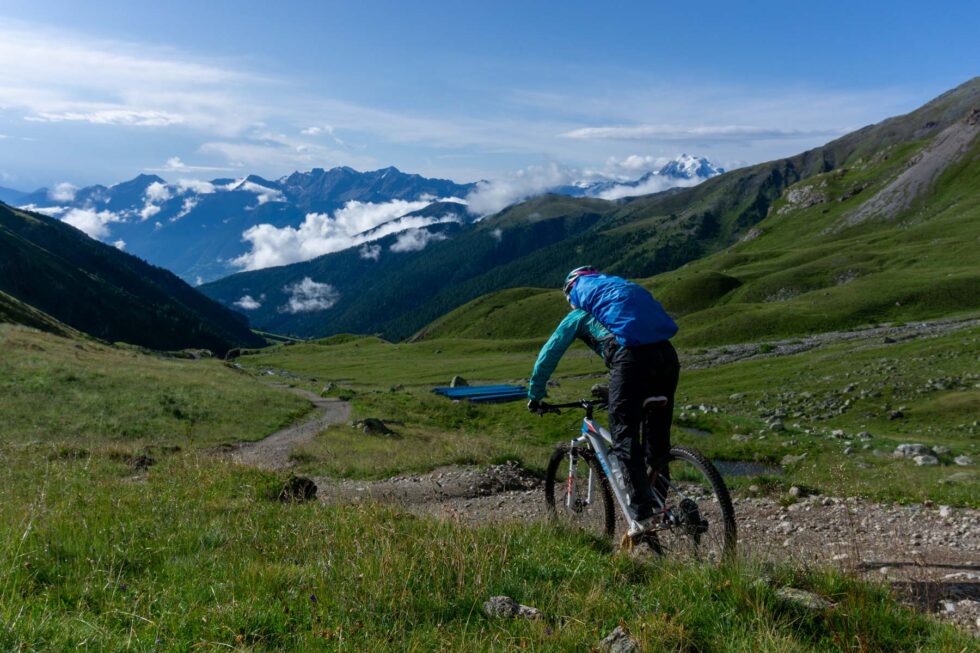 Nach dem Frühstück zeigt das Thermometer an der Hütte 5 °C. Wir ziehen uns alles an, was wir dabeihaben und pedalieren vom Rifugio Val Viola zum Passo di Val Viola. Es schneit leicht in dünnen Flocken. Dort starten wir unsere 2000 Höhenmeter lange Abfahrt durch das Val da Camp. Zunächst ist das Gelände verblockt und es geht ruppig bergab, wenig später fahren wir über trockene Wurzeln und mittelgroße Steine. Die Sonne scheint uns ins Gesicht und je mehr Höhe wir verlieren, desto mehr Kleidung ziehen wir aus.