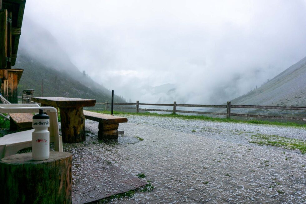 Es donnert, Philippe fährt einige Meter hinter mir, ruft nach mir und winkt. Gemeinsam suchen wir uns das größte Vordach eines Hüttchens und drücken uns an die Wand. Wenige Sekunden später startet Platzregen mit 5 mm großen Hagelkörnern. Nach diesem nassen Intermezzo düsen wir am Nationalpark Stilfser Joch, am Passo di Fraele ins Val Viola. Von dort geht es noch einige hundert Höhenmeter auf das ehemalige Kasernengebäude Rifugio Val Viola.